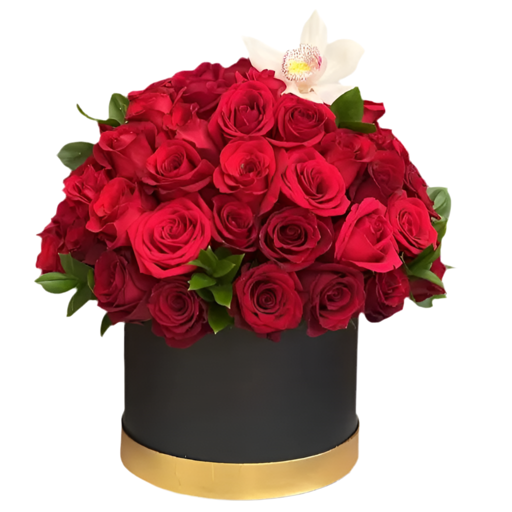 Donde comprar caja de 50 rosas rojas en Miami - Elegante caja negra de lujo con 50 rosas rojas premium. Regalo romántico perfecto para San Valentín, aniversarios, propuestas de matrimonio y ocasiones especiales. Tarjeta con mensaje personalizado GRATIS. Entrega el mismo día en Doral Florida.