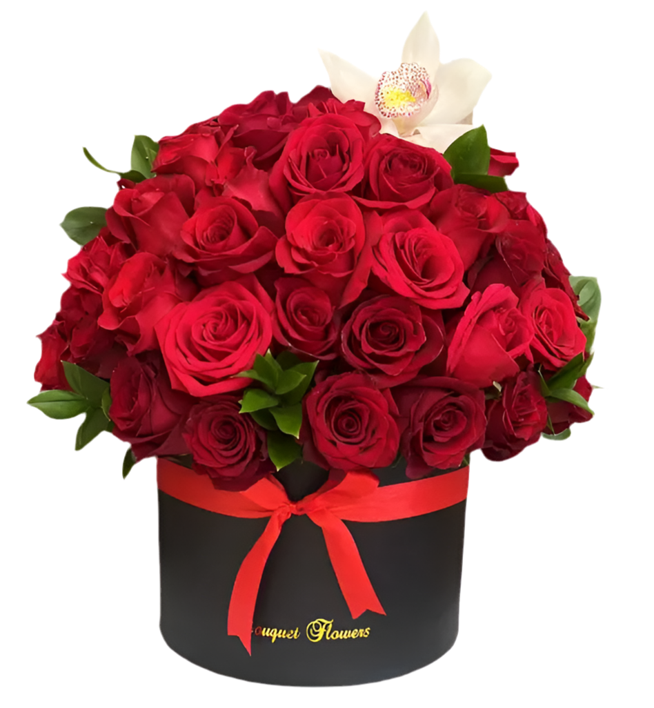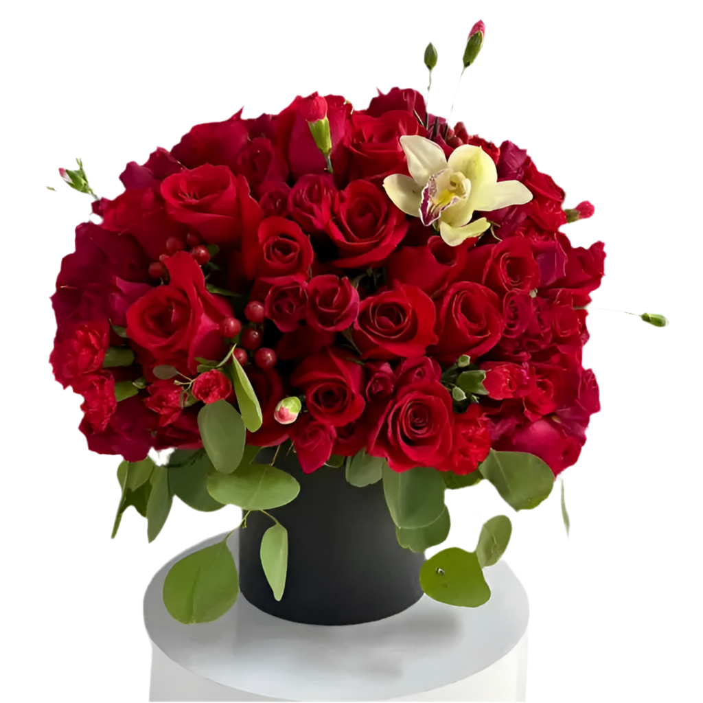 Descubre Royal Red Luxury, una obra maestra floral perteneciente a nuestra prestigiosa Gold Collection, diseñada para quienes buscan lo más extraordinario en el mundo del lujo. Este exclusivo diseño reúne 100 rosas rojas premium de selección elite, acentuadas con follaje fresco y una orquídea exótica cuidadosamente integrada, creando una composición de sofisticación absoluta y presencia imponente.