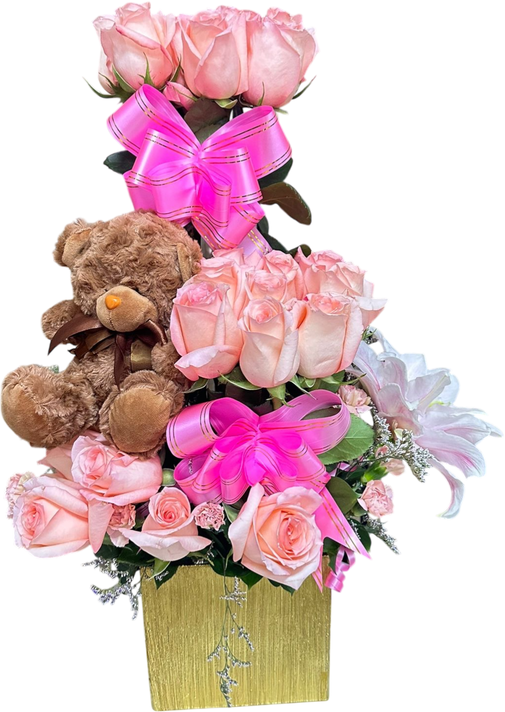 Hermoso arreglo floral en caja dorada con rosas rosadas premium, lazos decorativos y tierno osito de peluche, ideal para regalos en Miami. Perfecto para cumpleaños, quinceañeras, aniversarios, baby shower, nacimiento de bebé o regalo romántico. Este diseño exclusivo transmite amor, ternura y alegría, convirtiéndose en un detalle inolvidable para sorprender en Doral, Brickell, Downtown Miami, Coral Gables y Kendall. Entrega rápida y segura en toda el área de Miami.