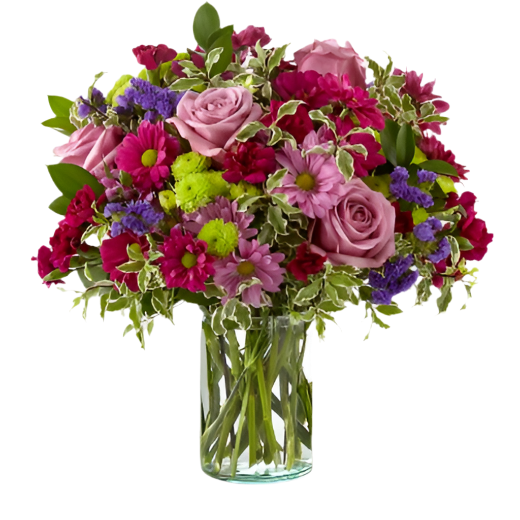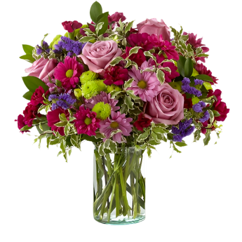 Dulce Sentimiento Deslumbra con impresionantes tonos violetas y verdes dentro de un jarrón cilíndrico de vidrio, una colección de rosas, margaritas y flores, nuestro ramo envía un sentimiento dulce a lo profundo de cada flor, encuentra 3 tamaños distintos para elegir.
