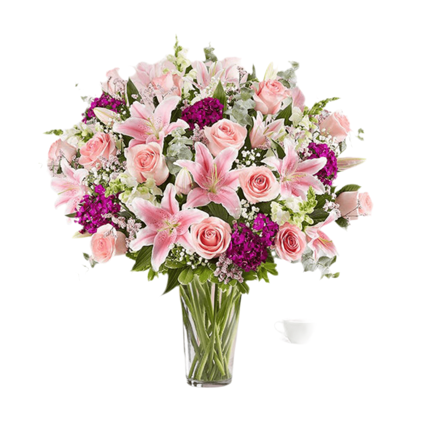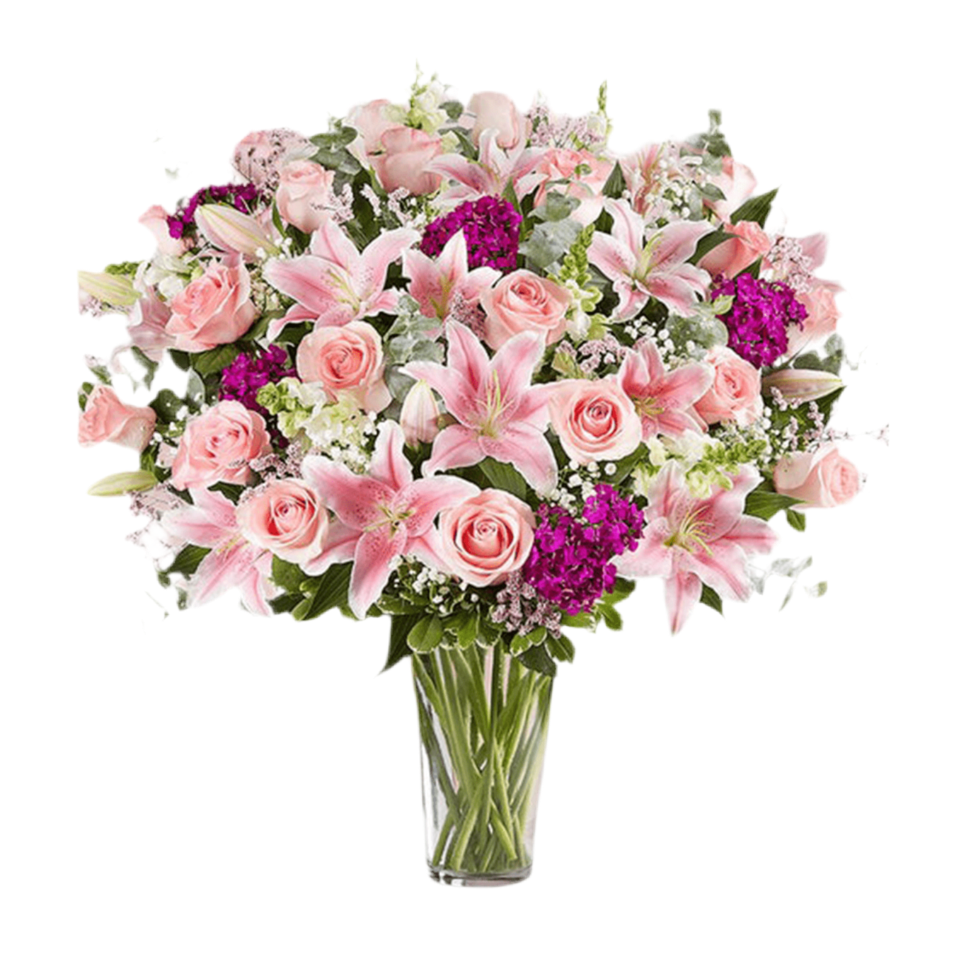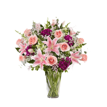 Arreglo completo con rosas rosadas, lirios y limonium, dragones blancos y dianthus púrpura; acentuado con una variedad de verdes,
