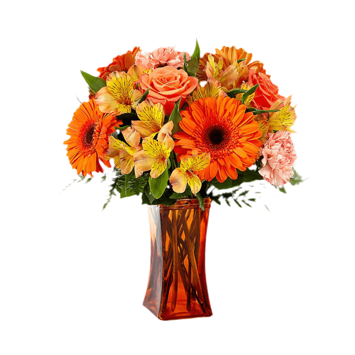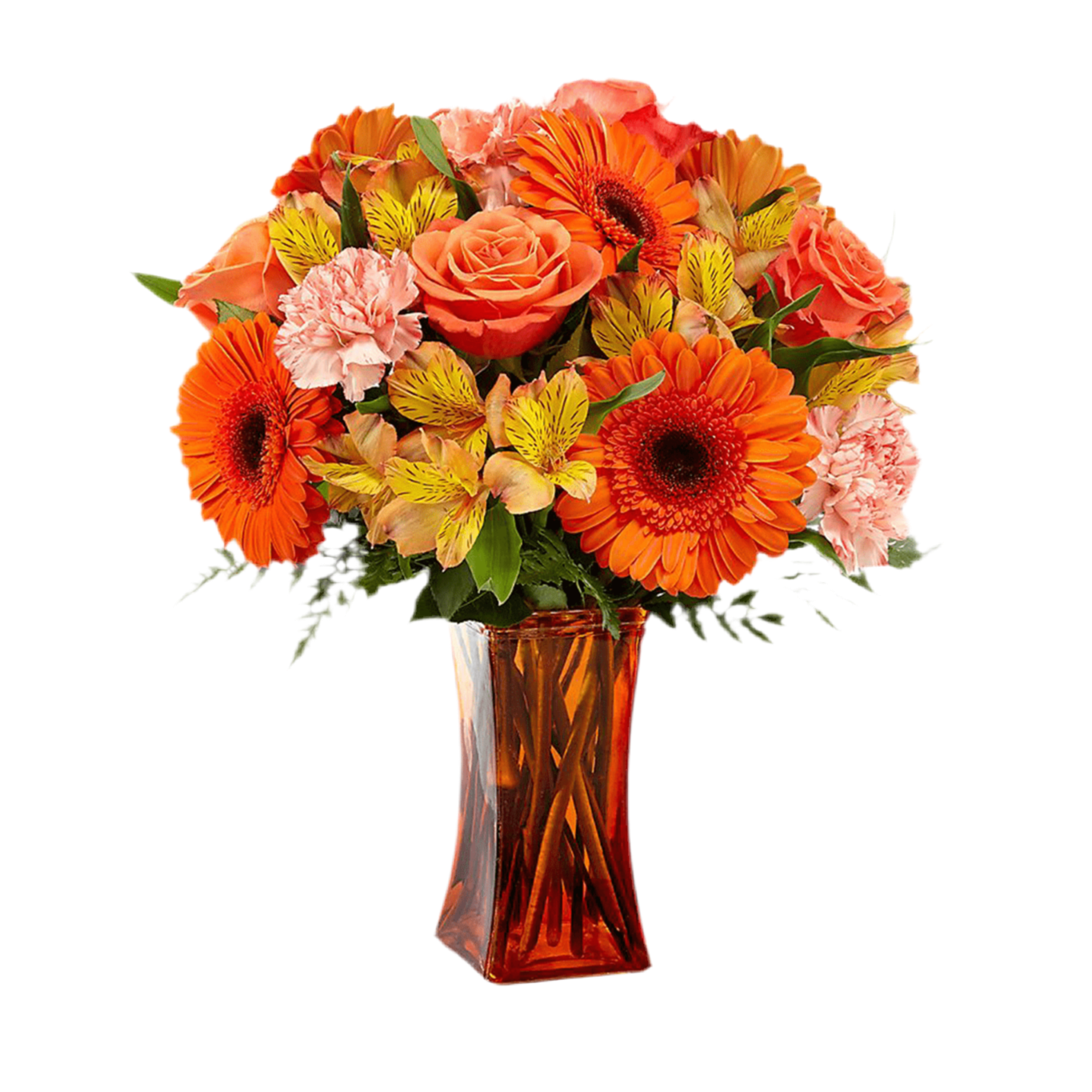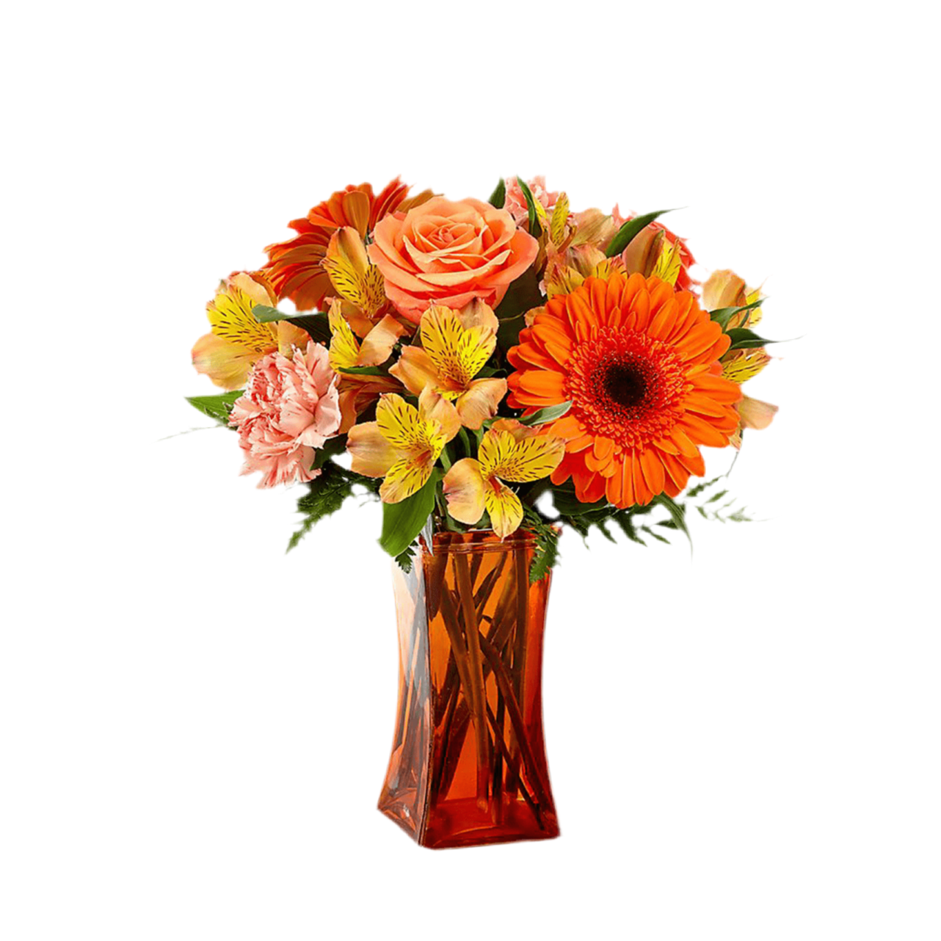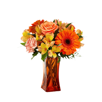 Presentado en un florero de vidrio naranja* para darle un aspecto bello y reluciente, el ramo de flores es una forma maravillosa de expresar ¡feliz cumpleaños! pensando en felicitaciones,