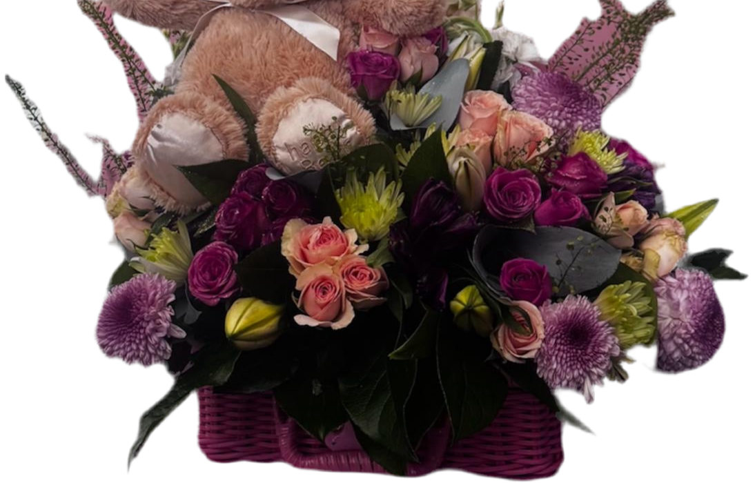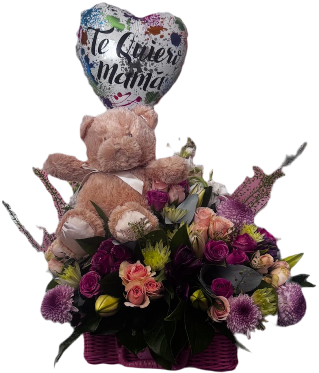 Sorprende a mamá con esta espectacular canasta regalo completa que incluye rosas frescas, globo temático y tierno peluche en Doral, Florida.