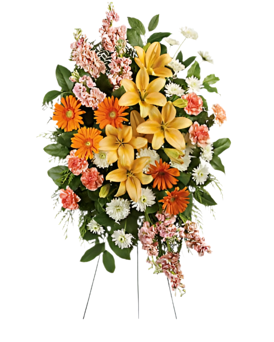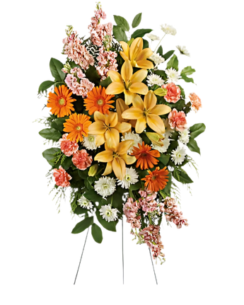 Este arreglo floral para funeral ha sido diseñado especialmente para celebrar la vida del ser querido. Los tonos cálidos de melocotón y naranja transmiten la luz y alegría que esa persona especial trajo al mundo, mientras que los lirios representan la paz eterna.
