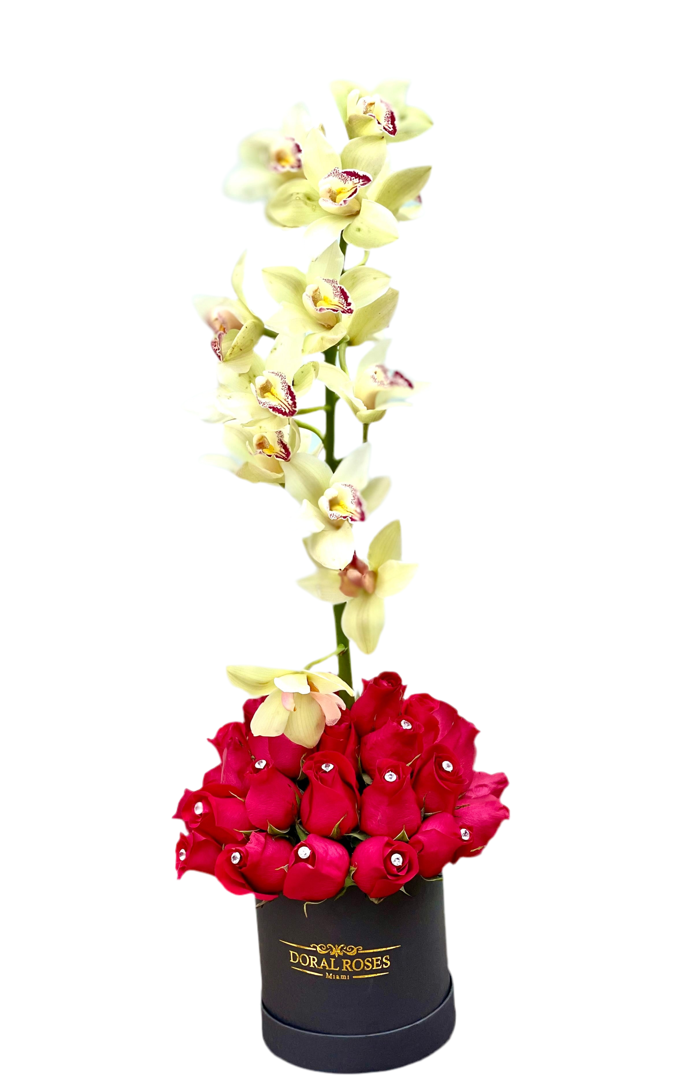 Flowers Roses Doral - Arreglo floral en caja con rosas rojas y hermosa orquídea