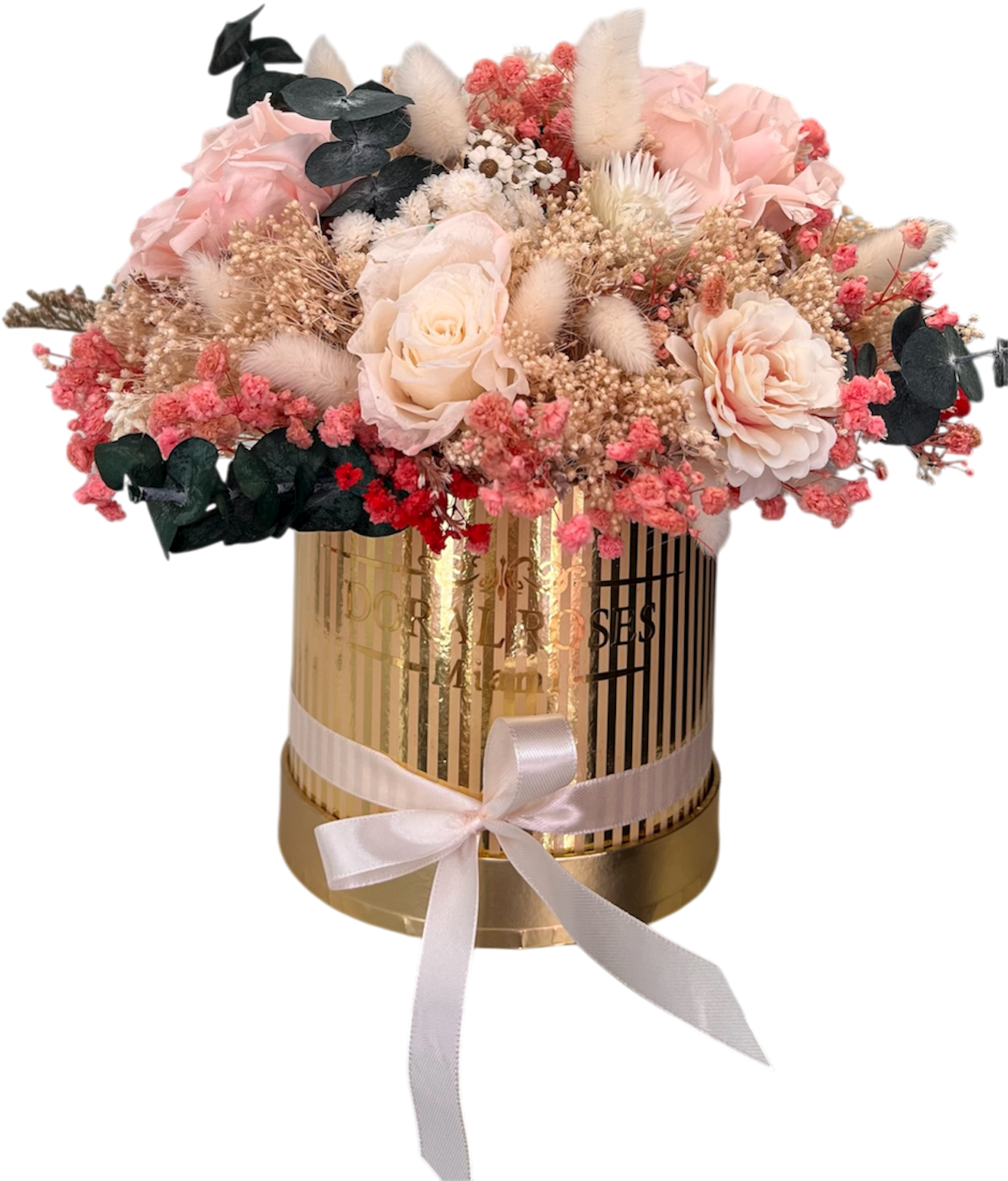 Desbloquea tu potencial decorativo con esta fantástica caja de flores preservadas en tonos beige y dorado. Perfectas para complementar vestidos de novia y añadir un toque de color y elegancia a cualquier habitación o evento especial en Miami con entrega el mismo día en Doral Florida.