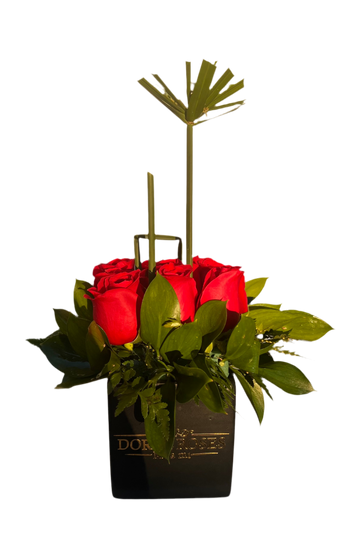 Sorprende con creatividad y elegancia con nuestro arreglo Creativa de 4 Rosas Rojas. En Doral Roses Miami, combinamos diseño innovador con la belleza clásica de las rosas rojas para crear arreglos que cautivan y enamoran.