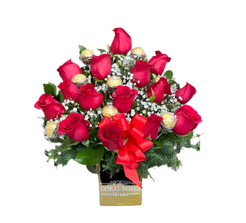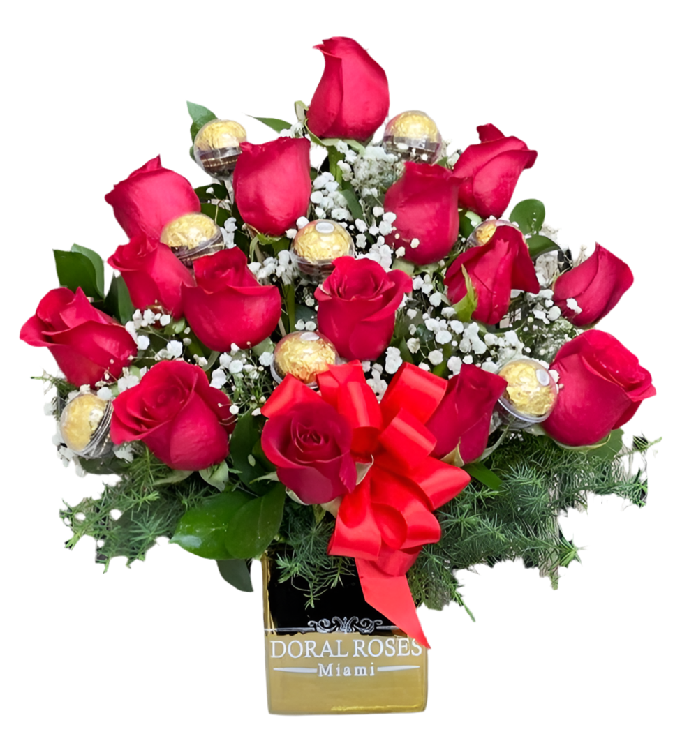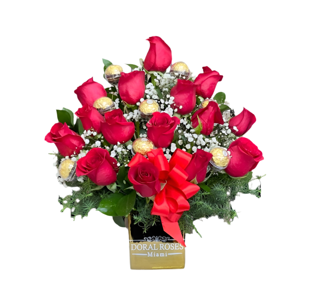 Un arreglo que combina pasión, elegancia y dulzura para momentos inolvidables. ¡Ordena hoy y sorprende con entrega garantizada en Doral y Miami!