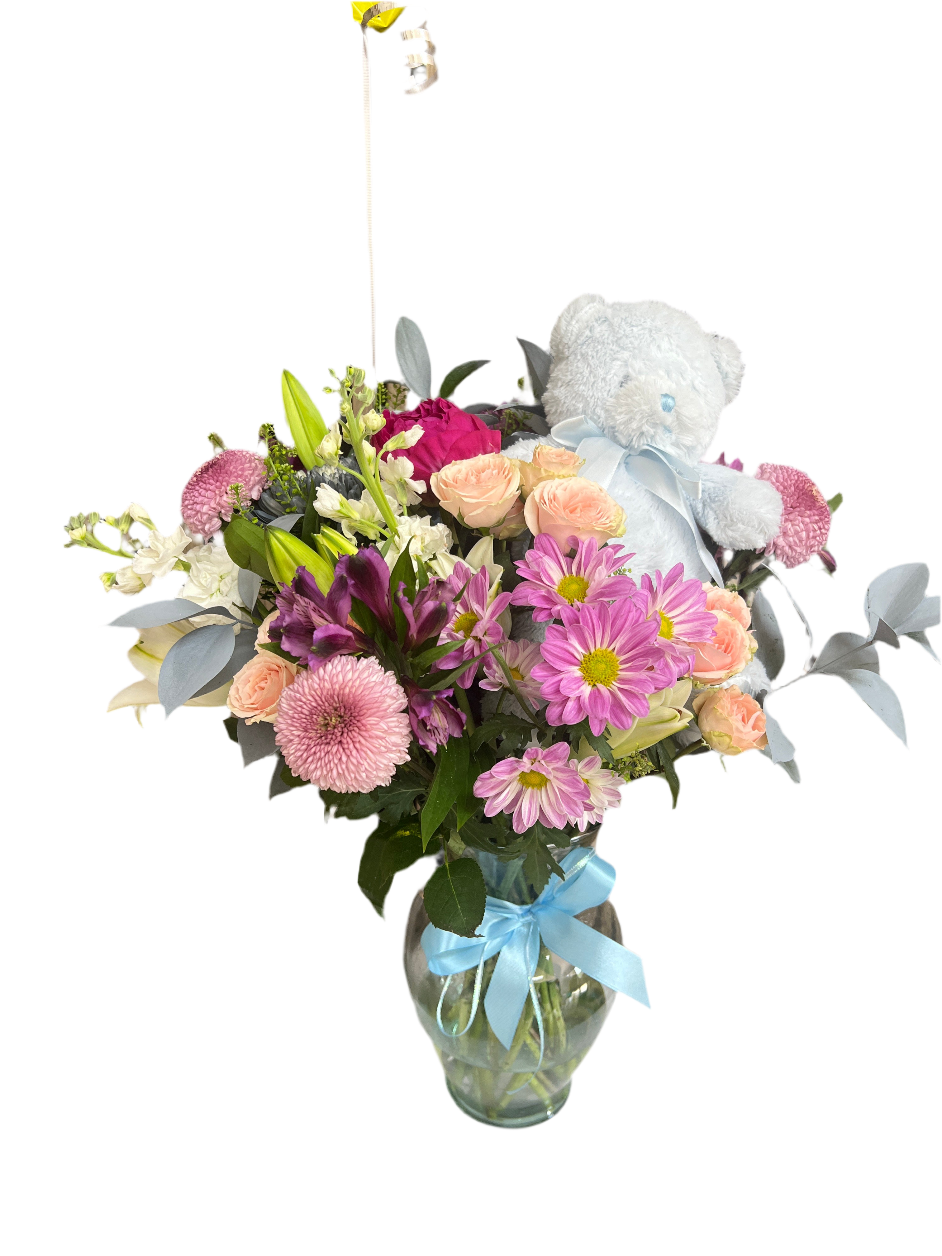 Celebra la llegada del nuevo bebé con este adorable arreglo floral de baby shower que incluye flores frescas, globo temático y tierno peluche en Doral, Florida.