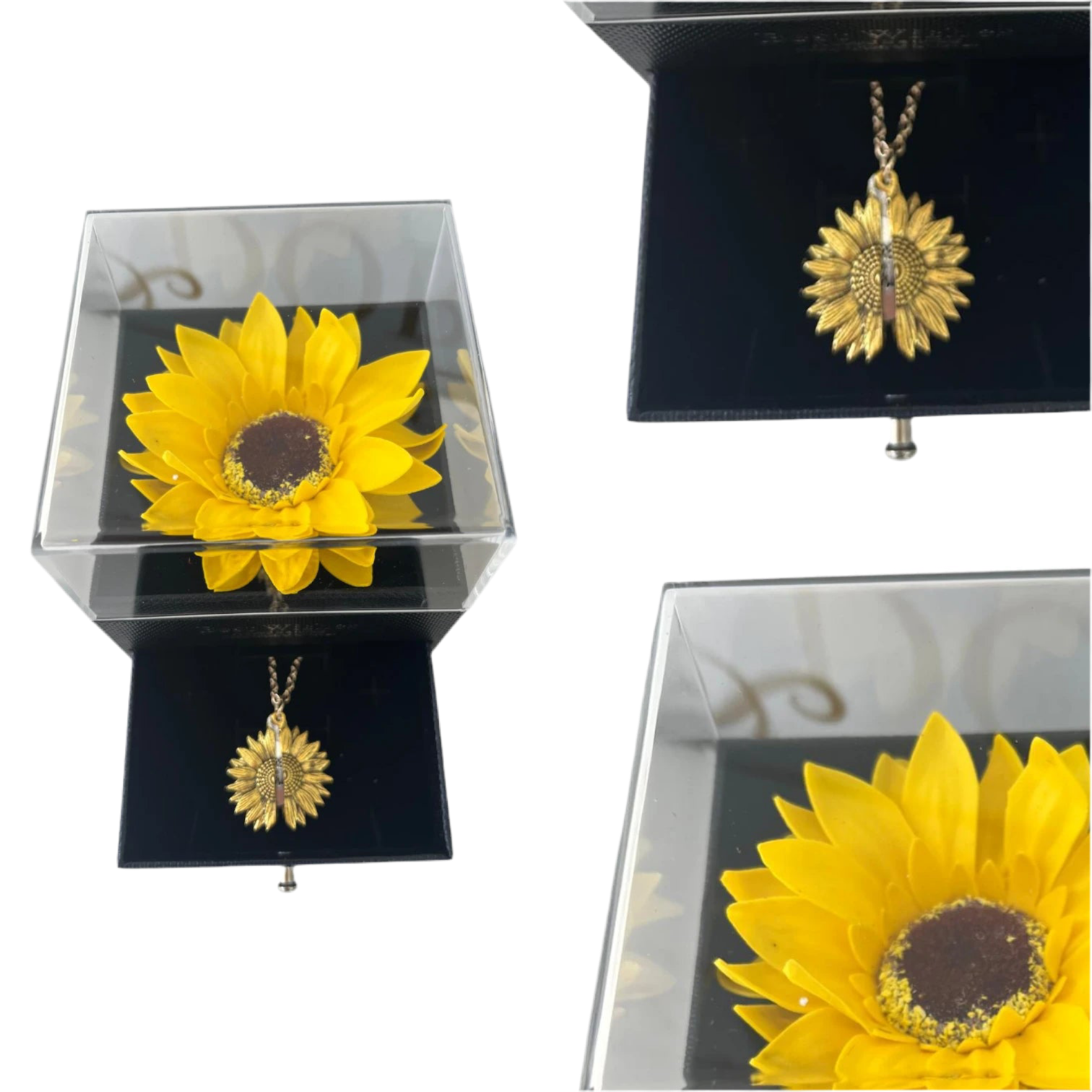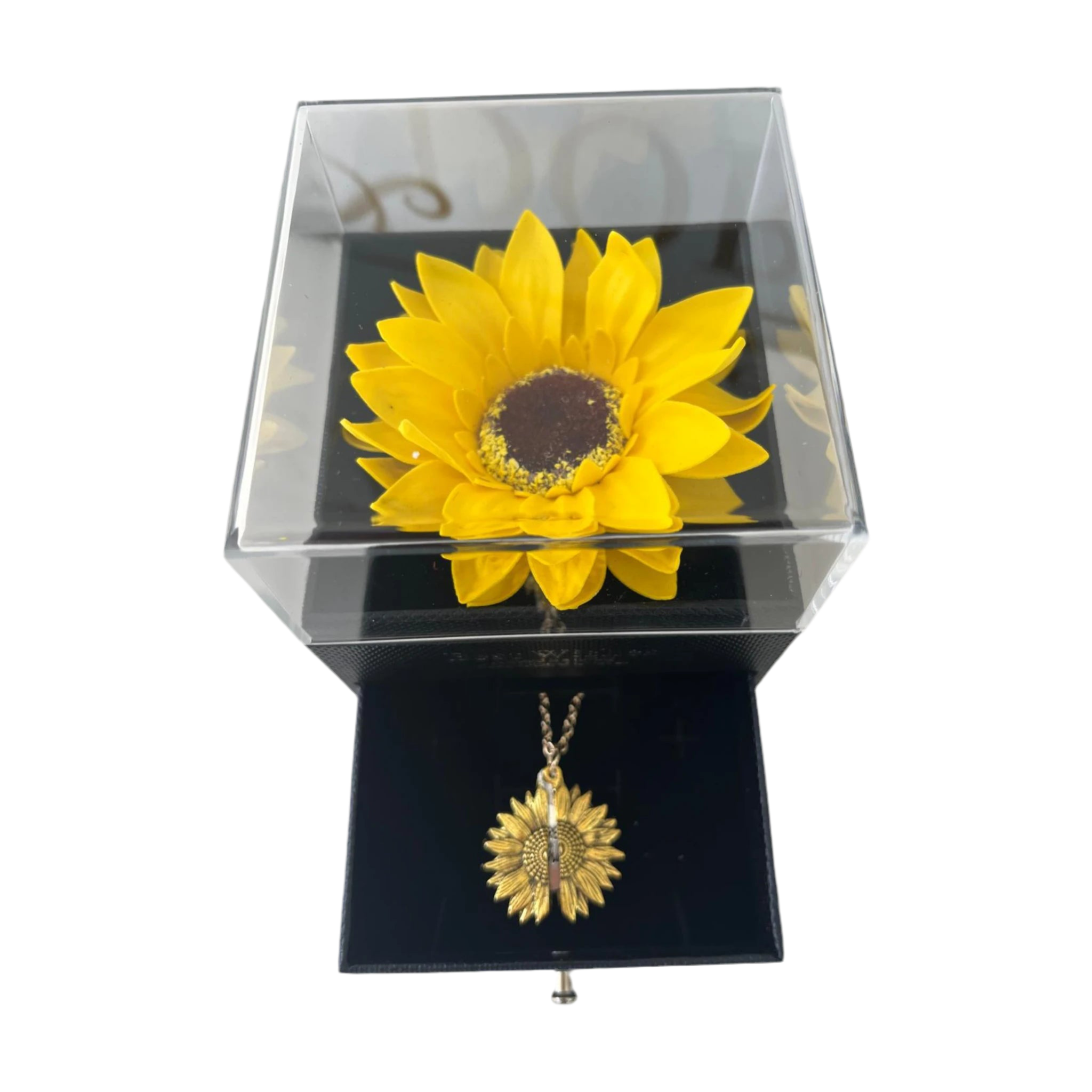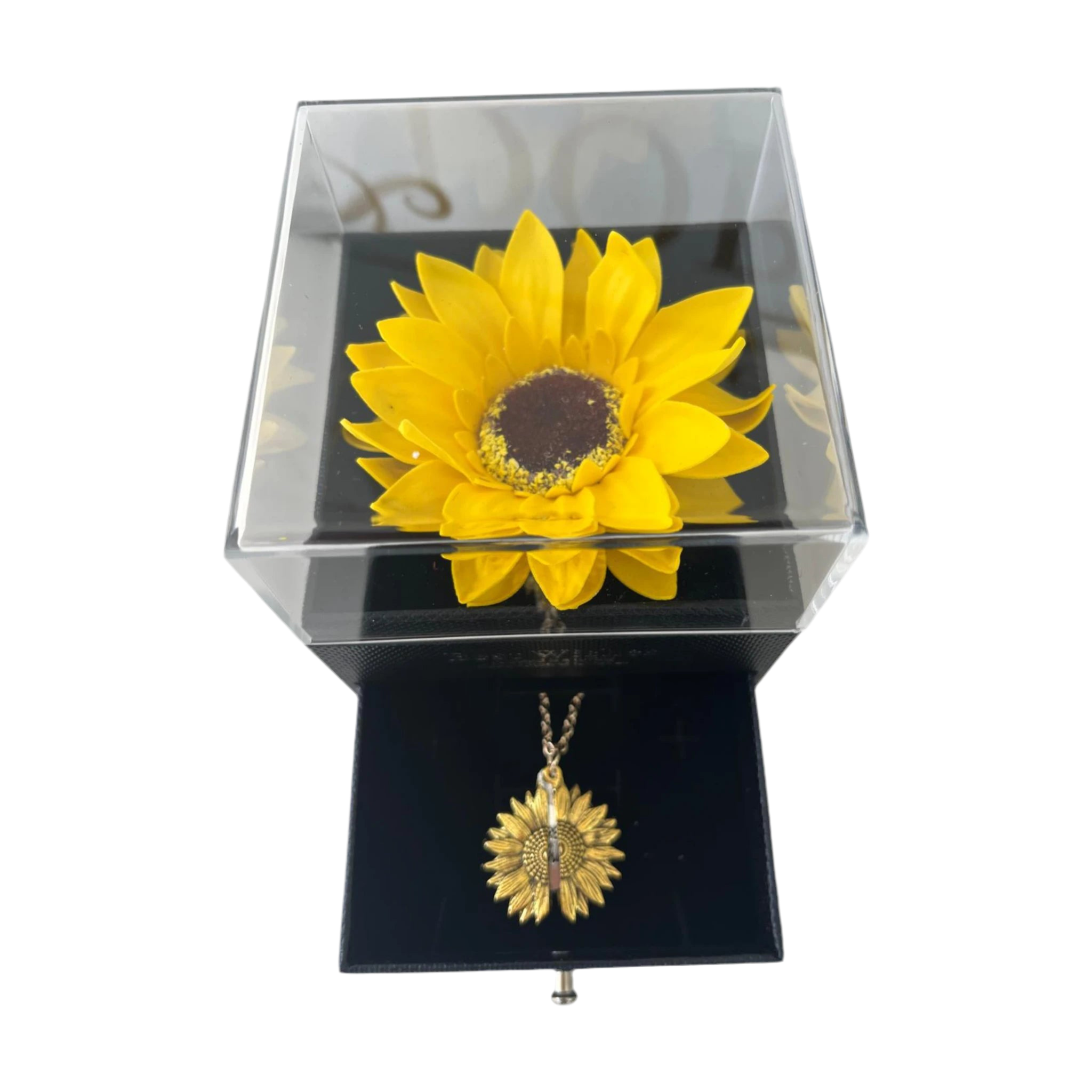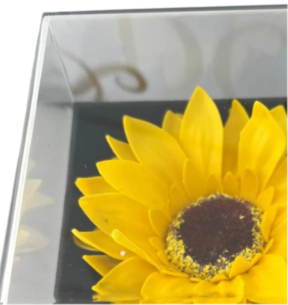 Este impresionante regalo presenta un delicado girasol cuidadosamente preservado y presentado en una elegante caja, lo que lo convierte en la elección perfecta para cualquier ocasión especial. Dale un toque de naturaleza y sofisticación a tu hogar o sorprende a un ser querido con este exquisito y exclusivo regalo.