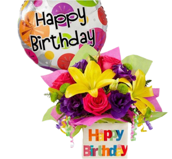 Arreglo floral con globos cumpleaños, hermoso detalle lleno de colores para sorprender en una fecha especial, sorprende con flores de temporada.